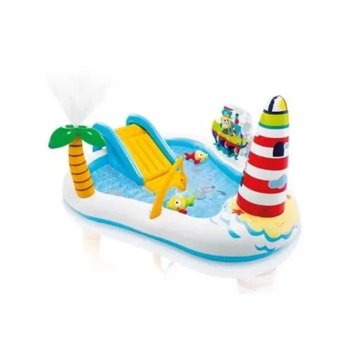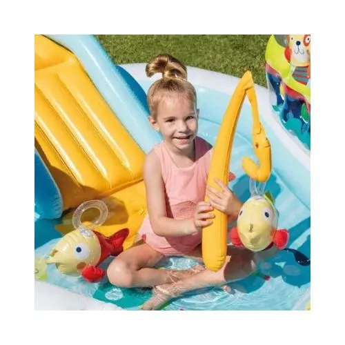 Fabricado pela renomada marca INTEX, este playground aquático é completo: escorregador, borrifador de água, vara de pesca inflável, peixinhos e bolinhas para brincadeiras sem fim! 🐟🎈