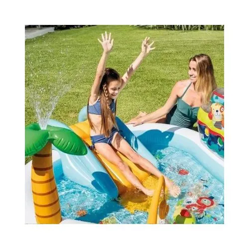 Com um design seguro, piso reforçado e peças infláveis macias, o Playground Pescaria Intex oferece diversão com conforto e proteção para os pequenos. A palmeira borrifadora de água proporciona ainda mais frescor e alegria. 🌴💧