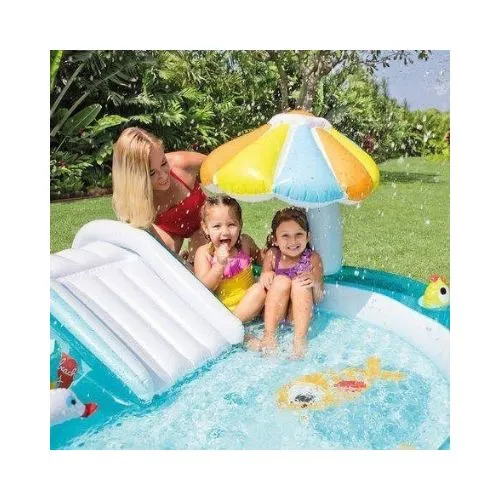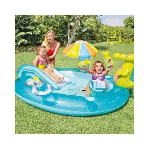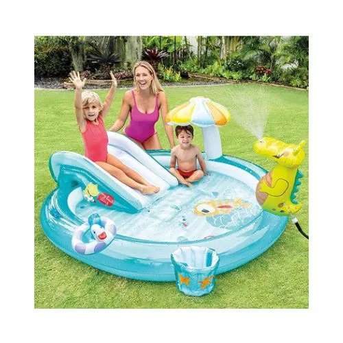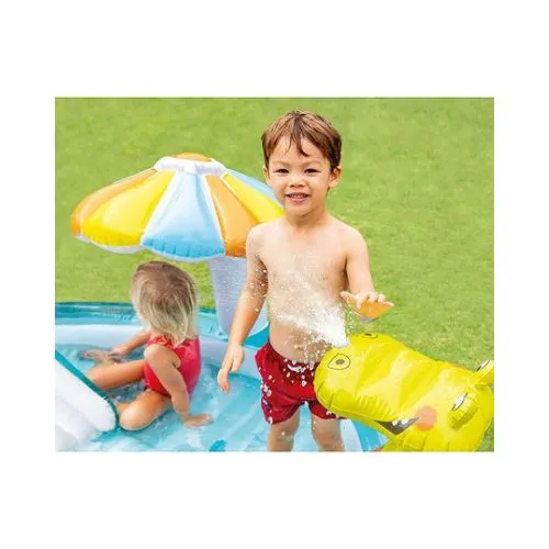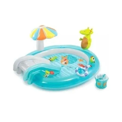 Fabricado pela Intex, este playground é feito em PVC resistente e vem com acessórios infláveis superdivertidos, como guarda-sol em forma de cogumelo, balde, pato e o simpático jacaré que solta jatos de água!