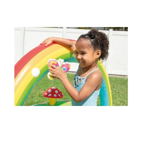 Este modelo traz um design criativo com tema de jardim, contendo escorregador, cogumelos infláveis, borboletas, bolinhas coloridas e um arco-íris que esguicha água ao ser conectado a uma mangueira. Tudo isso com qualidade e segurança que só a marca Intex oferece!